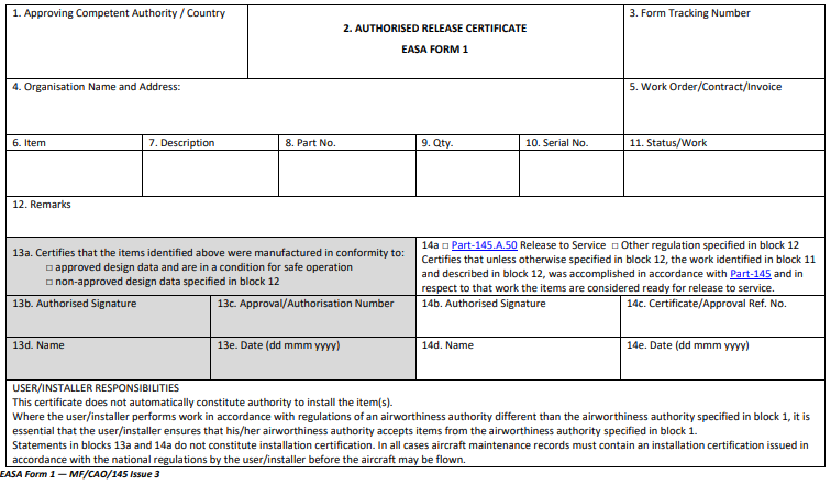 Note: the procedures to fill an EASA Form 1 are detailed in EASA Part 21 Appendix I to Annex I (for production organizations) and Part M Appendix II (for maintenance organizations). The procedure to fill a FAA Form 8130-3 is detailed in the FAA Order 8130.21G.